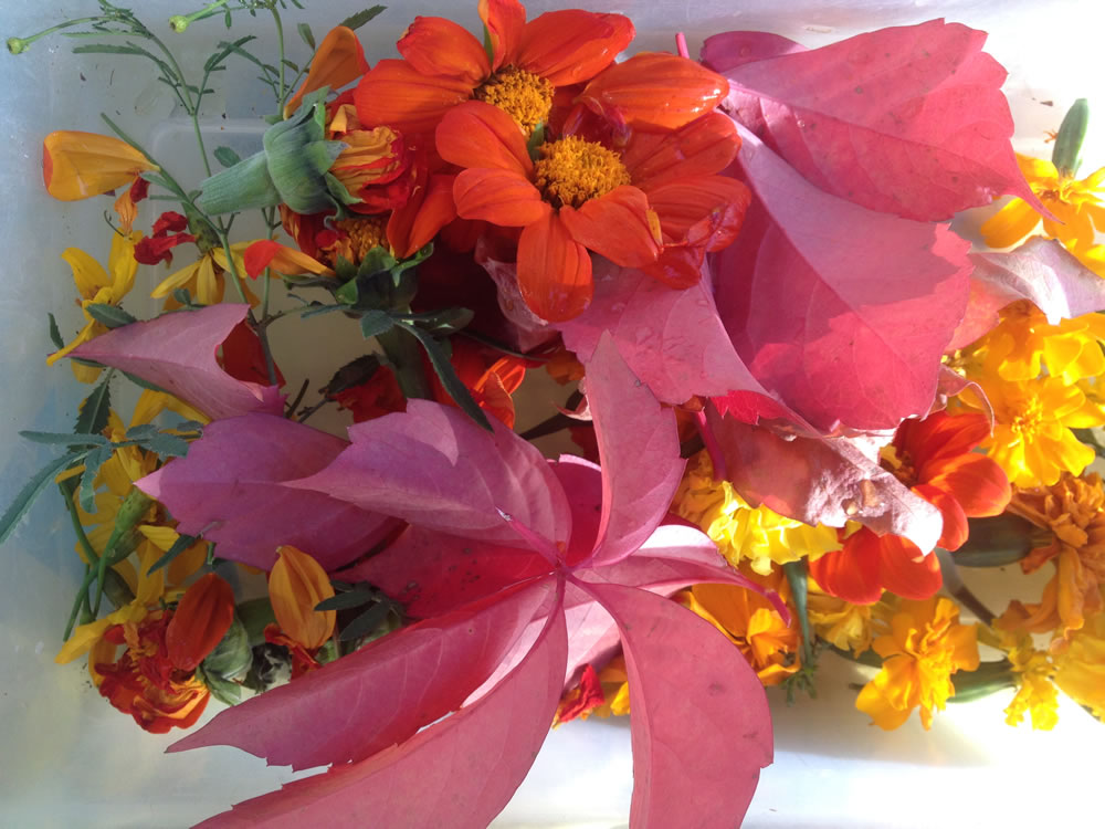 Harvesting flowers and leaves – they went into jars to be dyeing during the winter.