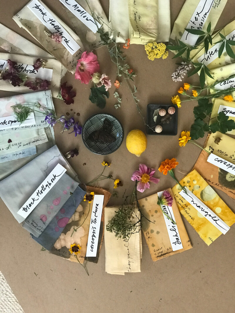 Some of the plants and their dyes on recycled strips of old cotton bedsheets.